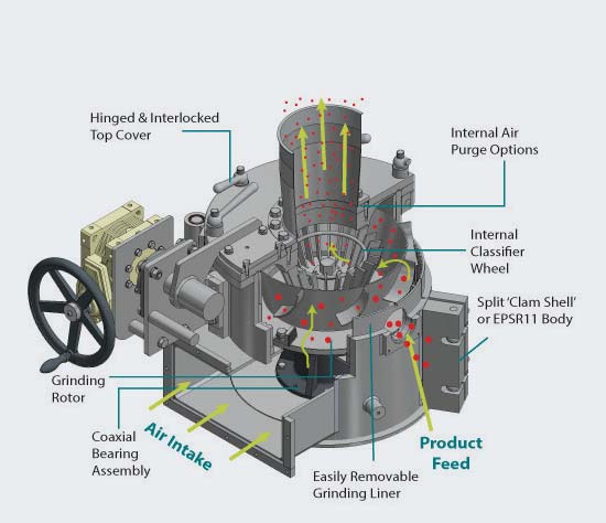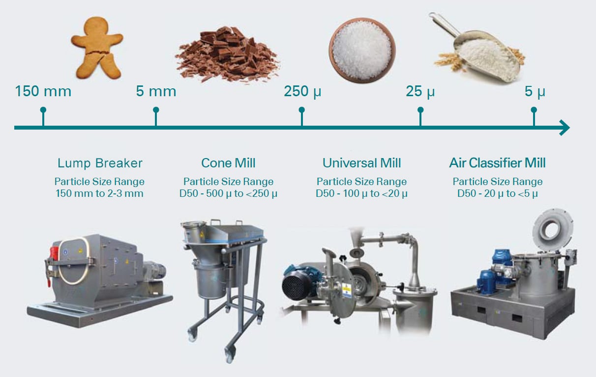 To protect against explosions, the Universal Mill can operate under vacuum to remove oxygen or have the oxygen replaced with inert gases like nitrogen or carbon dioxide.