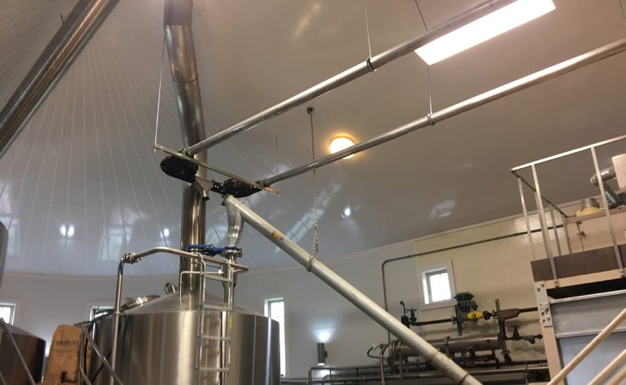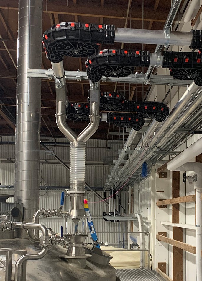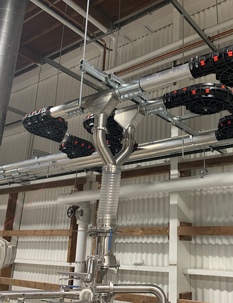 Chain disks use pucks connected by chain to drag grain or malt through tubing, which can be either metal or plastic. Their gentleness stems from the low amount of friction inherent between grain and these materials, as well as the low-friction components. Wheels at each corner suspend pucks away from the tubing at turns, reducing wear within the system—which augers are notorious for. This allows a single drive to convey product up to 2,000 ft with up to 24 turns and as many outlets as needed. The distance between the pucks and the piping make it seem like there would slippage/rollback up vertical climbs, but even milled grain creates a bridge larger than this gap.