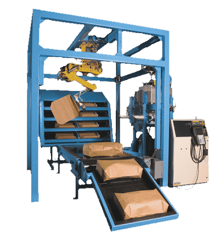 The TRV 1000 is a flexible bag placing solution that can place up to 12 bags per minute on its own conveyor or other equipment. It is able to accommodate single or multiple-spout applications and features a valve pre-opener.