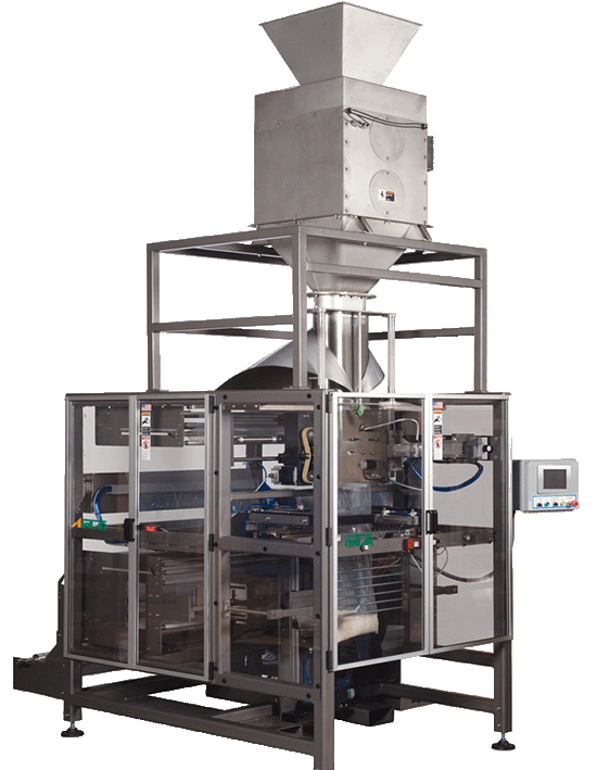 Gravity feeders allow the product to fall in the bag and be cutoff during transition via gates.