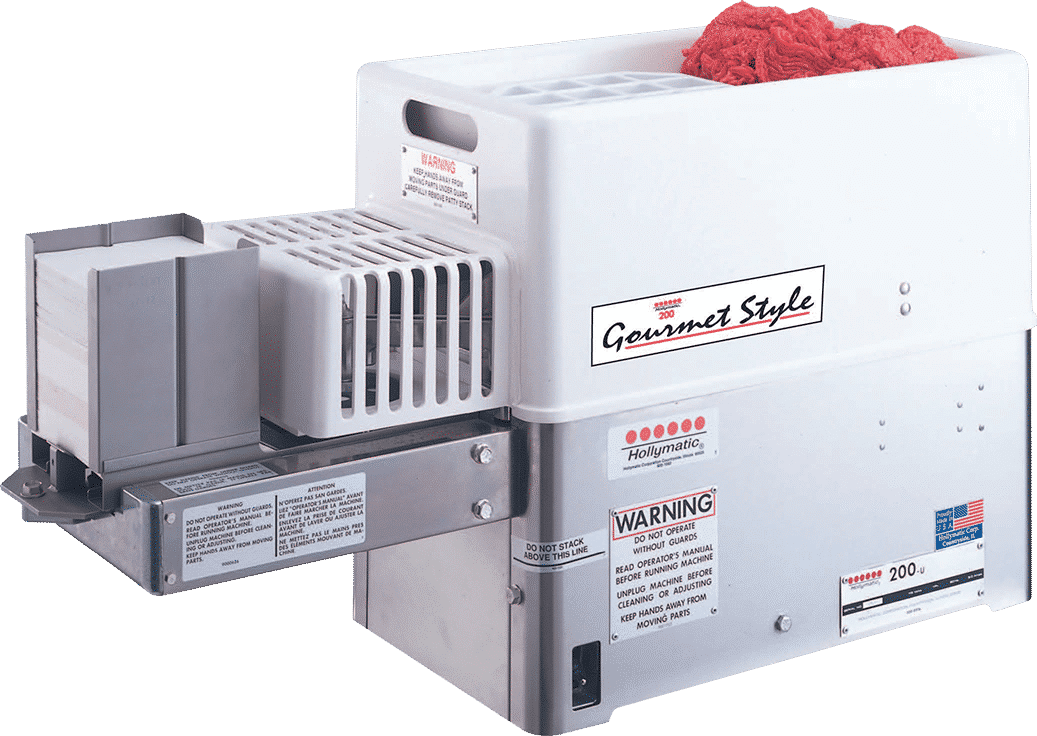 Capable of up to 1900 patties per hour in up to 5.3 oz. portions, the Deli Pattymaker is also popular in grocery stores and cafeterias. It delivers consistent portions in selectable shapes and automatically separates patties with paper. Mold plates from 3/16” x 4.5” to 3/8” x 4.7” are included, and the machine can be set to run at 1200, 1600, or 1900 portions per hour. All contact surfaces are food-grade and carts with wheels are available as an option for mobility.