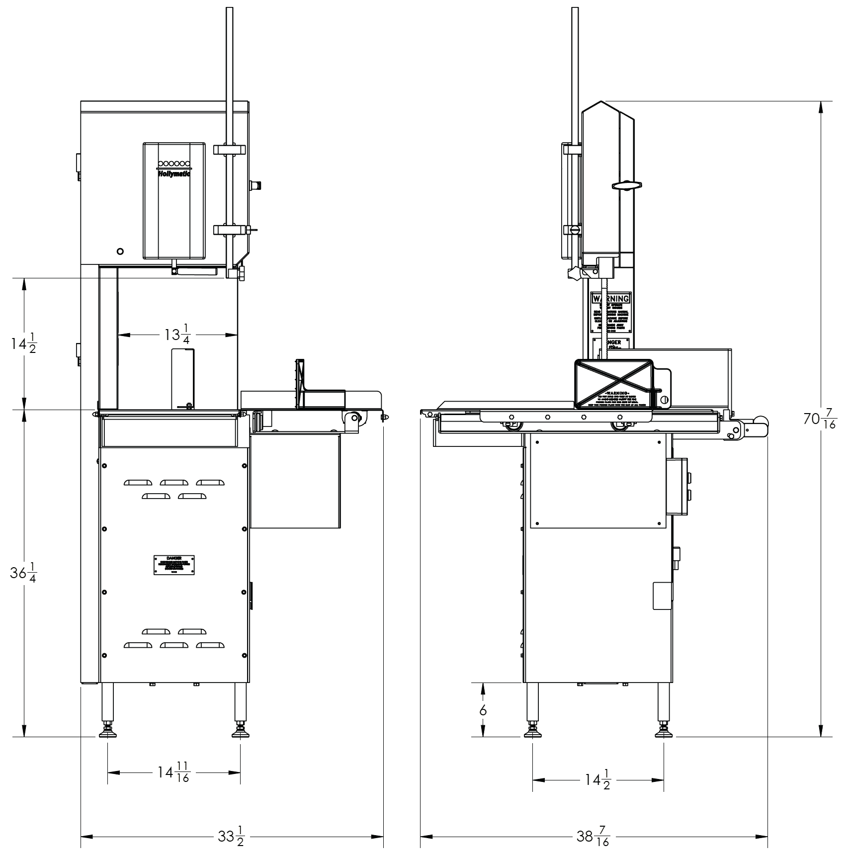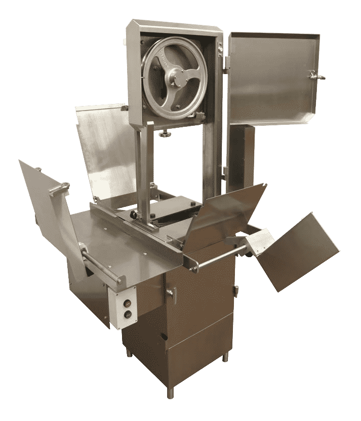 The 14” CLR Meat Saw is a rugged, efficient solution with food grade, stainless steel contact points and a number convenient features that simplify operation. The easily-removable upper and lower wheels, along with sloped upper housing allow easy water runoff and make washdown quick and effective. The band saw occupies a compact footprint (33.5” x 38.5”) making it suitable for nearly any size operating floor, and the 3HP motor with  5/8” x 114” hardened steel blade can cut through virtually anything that can fit in the 14" clearance. With safety interlocked doors, double flanged wheels, and minimized blade coasting, these saws from Hollymatic are regarded as the most durable and effective solutions available.3” x 37.5”) and the 3HP motor with  5/8” x 114” hardened steel blade can cut through virtually anything. With safety interlocked doors, double flanged wheels, and minimized blade coasting, these saws from Hollymatic are regarded as the best value and longest-lasting solutions in the category today.