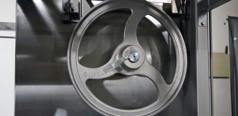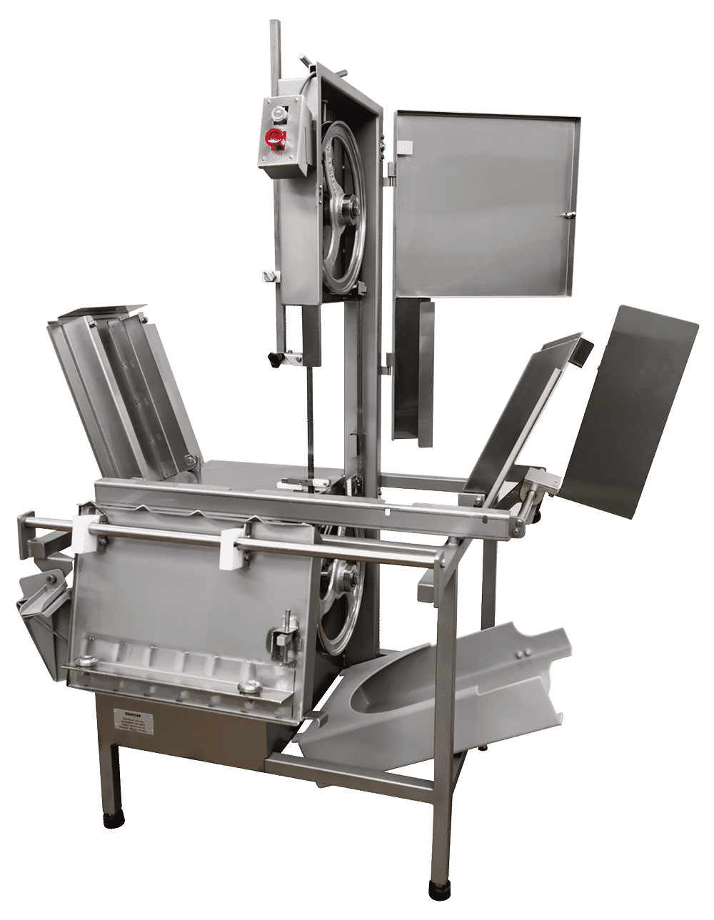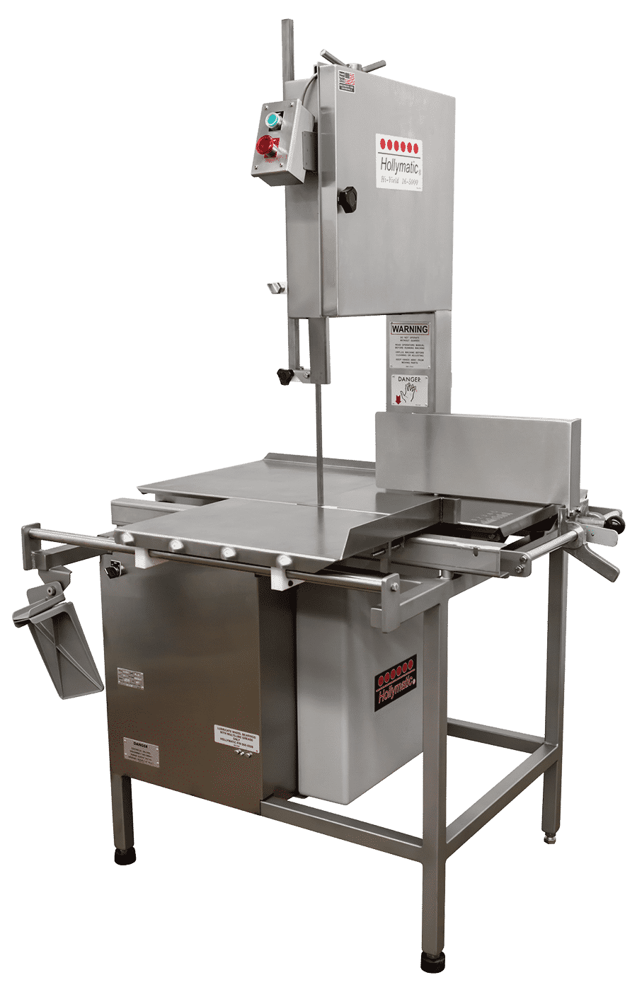 The 16” Meat Saw offers all the benefits of the 14″ Meat Saw, with the addition of 2″ more clearance, a 3-speed saw drive, and a 1-second blade brake. The easily-removable upper and lower wheels and open-hinge design make washdown quick and effective. The band-style saw occupies a compact footprint (43” x 37.5”) and the 3HP motor with 5/8” x 114” hardened steel blade can cut through virtually anything. With safety interlocked doors, double flanged wheels, and minimized blade coasting, these saws from Hollymatic are regarded as the best value and longest-lasting solutions in the category today.