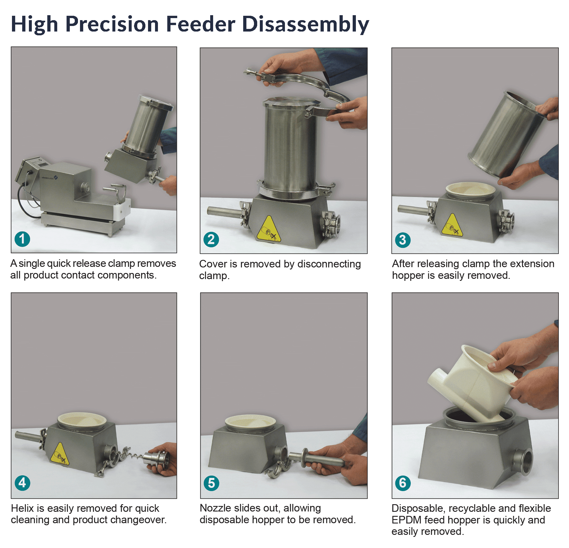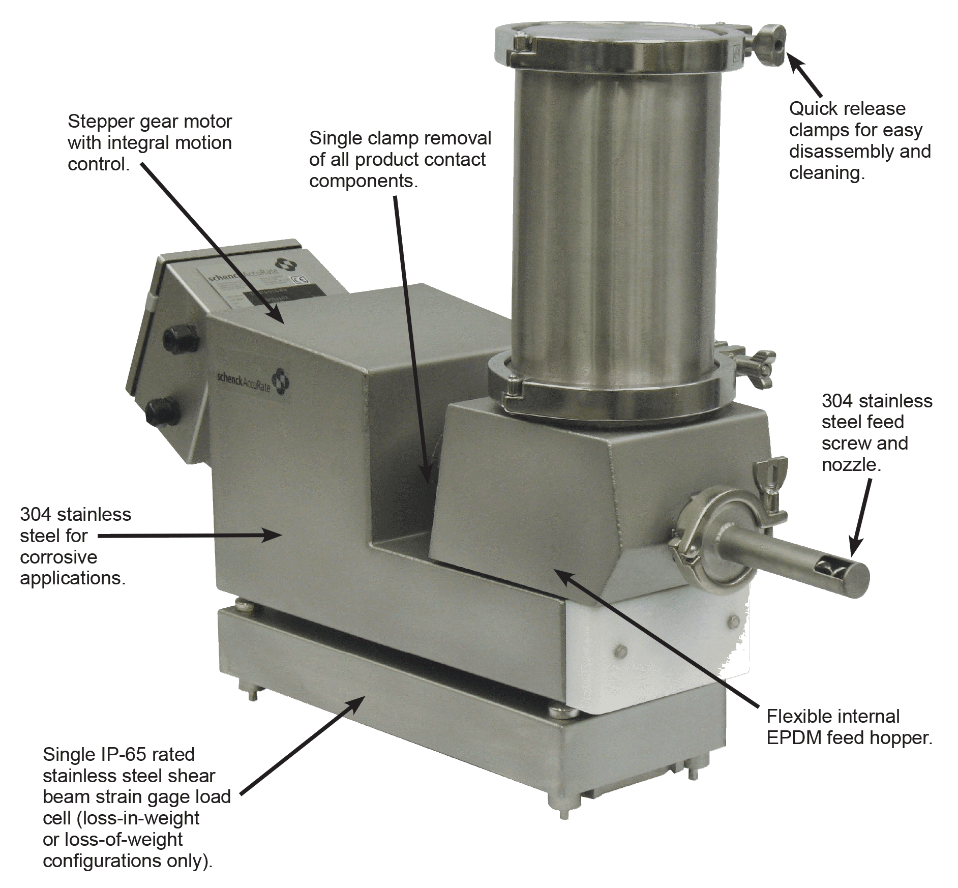 Ideal for volumetric or gravimetric low feed rate applications. This unit features a quick and easy disassembly dual arm external hopper agitation system for maximizing material handling versatility and simplified maintenance. Disposable or recyclable EPDM feed hoppers are also available.