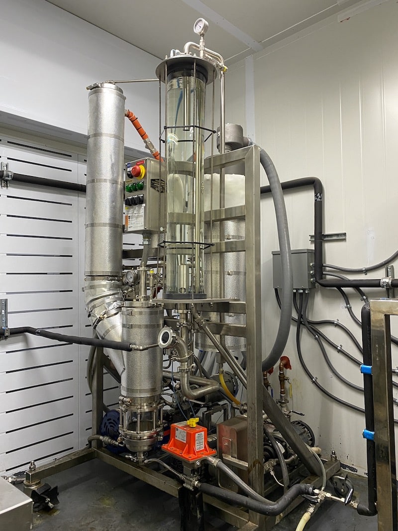 The Yellowstone falling film evaporators are the most efficient on the market and are sold and serviced from our facility with real 24/7 service. The Yellowstone unit provides numerous efficiency-boosting features including vapor heat recapture and inlet pre-warming, a super-high surface area disperser which does not need level ground, and chiller-less operation. Not only does the chiller-less condenser perform more efficiently at lower cost than the cold-plate method, but it allows the machine to be throttled much higher for low-concentration batches without being limited by the chiller.
